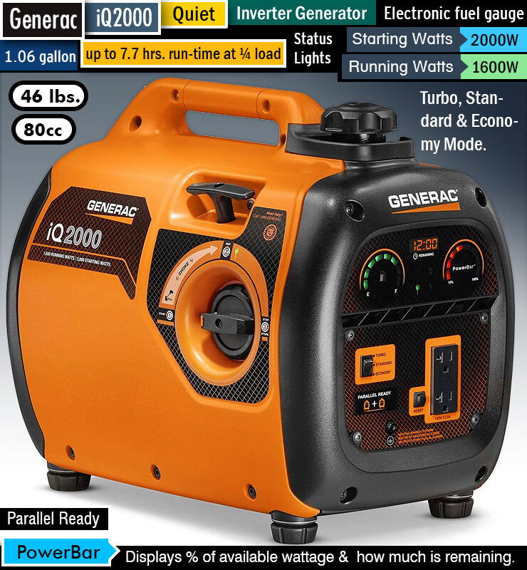 Generac's gp3000i inverter generator provides you the power you need wherever you need it. Ideal to quickly start and operate power tools, rv air conditioners and other motor driven equipment. Westinghouse outdoor power equipment igen2200 super quiet portable inverter generator 1800 rated & 2200 peak watts, gas powered, carb compliant. Item 3 pulsar 2200 watt portable dual fuel gasoline propane inverter generator pg220. Generac 6877 parallel kit for iq2000 portable inverter generator. The eu2200i can operate a wide variety of appliances, making it perfect for portable use at home or while. 4.5 out of 5 stars 1,769. 26.10.2021 · this inverter generator from generac is ideal for applications where portability is at a premium and power demands are modest. This further helps reduce the overall. So you can enjoy an extended power supply. The generator has a small 80cc ohv engine that produces a maximum of 2,200 watts and can continuously output 1,700 watts. Since the engine does not have to run continuously at full speed, it can significantly reduce fuel consumption by 20 to 40%. 4.4 out of 5 stars 586.